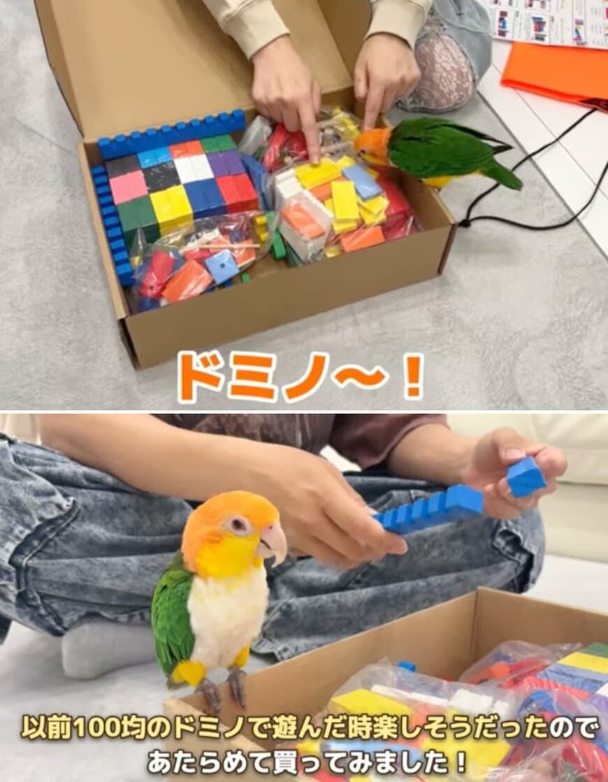 投稿に映っているのは、シロハラインコの「とろろ」ちゃん。カラフルなドミノが詰まった箱を興味深そうに眺めています。