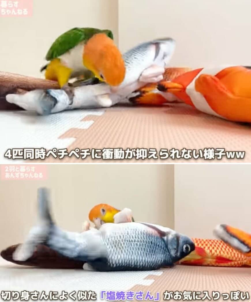 特に、前のおもちゃとよく似ている「塩焼きさん(@anz_omomiriさんが命名)」がお気に入りの様子です。