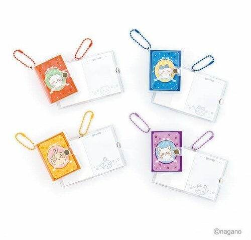 ボタン付きで中身が見えにくい、コンパクトサイズのメモキーチェーンです。レッドのちいかわ、ブルーのハチワレ、イエローのうさぎ、パープルのモモンガの4種を展開。