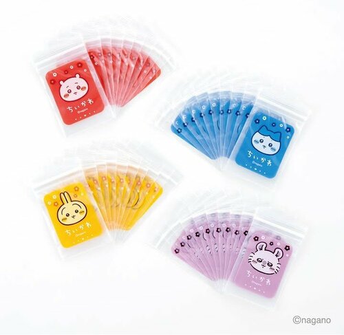 コンパクトな小物の収納に便利なB8サイズのジッパー袋です。小銭の受け渡しなどにも便利です。レッドのちいかわ、ブルーのハチワレ、イエローのうさぎ、パープルのモモンガの全4種類。12枚入りです。