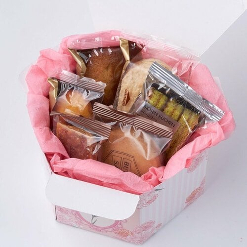 - 詰め合わせ内容:マドレーヌ×1個、フィナンシェ×1個、ダックワーズ×1個、フロランタン×1個、バターサブレ(2枚入)×1個、ノーテンクーヘンピスタチオ×1個
