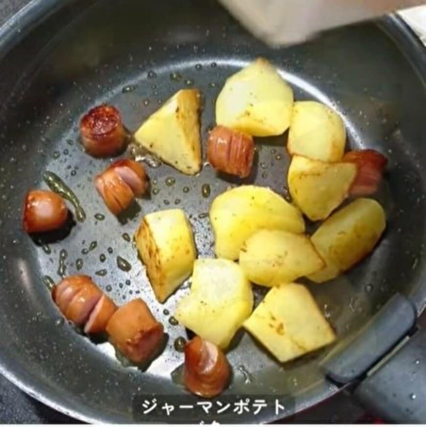 コンソメと粉チーズで味付けをして、ジャーマンポテトの完成。こんがりと焼き目がついて、とてもおいしそうです。