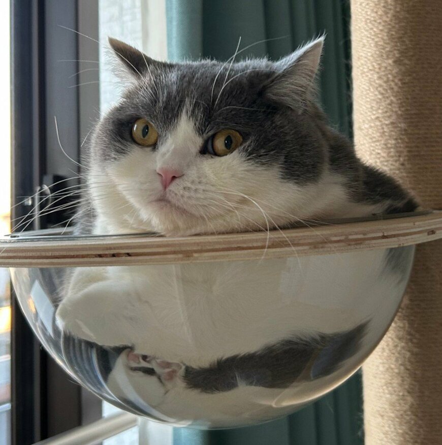 画像では、透明なアクリル製の半球型ボウルベッドにすっぽりと収まっていますね。