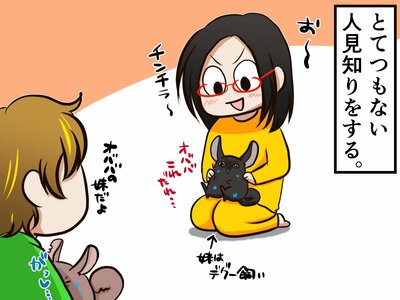 ある日のこと。祭さんのもとを、ひとりの女性が訪ねてきます。チンチラさんたちにとっては、初対面のこの女性。動物好きらしく、祭さんへの挨拶もそこそこに、小明神さんを触ろうと手を伸ばしてきます。「だ、誰???」と、いわんばかりにおびえるチンチラさんたち。小明神さんは女性に抱えられて硬直状態、大明神さんに至っては、祭さんにしがみついたまま、離れようとしない始末。
