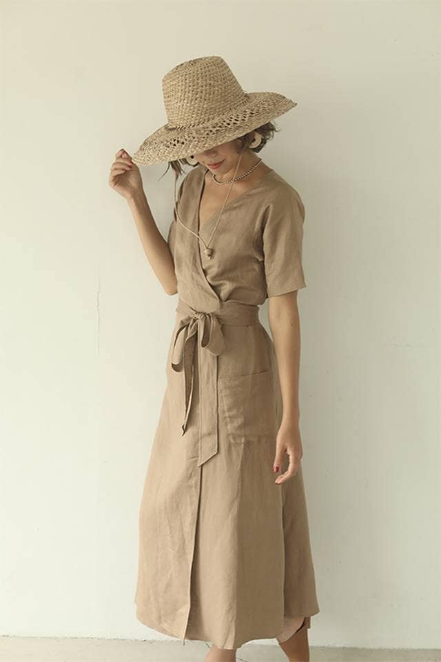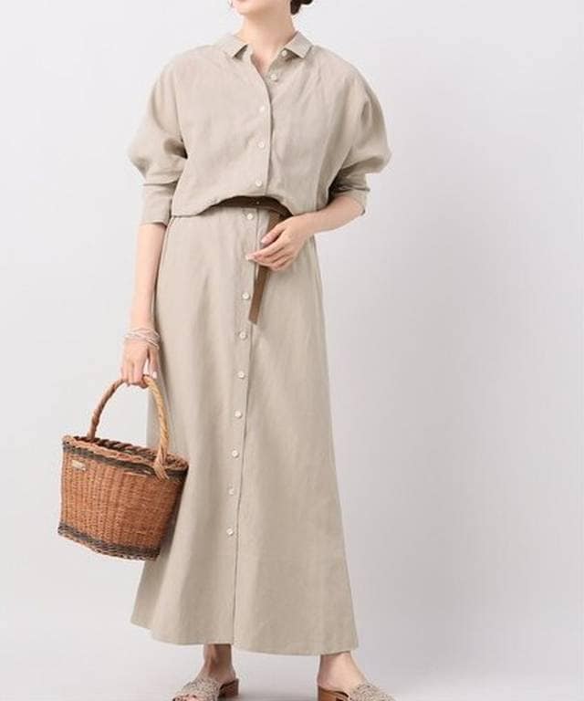 縦長ラインを演出する、ストレートシルエットのワンピース。ラフな雰囲気で落ち感がある「リネンレーヨン」を採用し、ワイドパンツを重ねても広がらない、すっきりシルエットを実現。