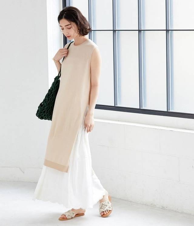 肌ばなれの良い生地だから、暑い季節にも使えます。縦長シルエットで、スタイルアップにも◎