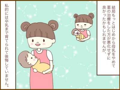 病院を受診したところ、先生から提案されたのは投薬治療。「できればミルクに切り替えて、お薬で治療しましょう」という先生の言葉に、当時完全母乳で娘さんを育てていたしらたまママさんは「薬を飲めば症状は治まるし、病気を早く治すことができるかもしれない。でも、そうなると娘を母乳で育てることができなくなる。」と迷います。