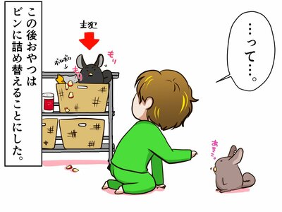 悪気なく、それを口にいれようとする大明神さんに、「えっ!どこかに落としてたっけ?」と焦る祭さん。「大ちゃん、それどこで拾ったのかな~。」と、言いながら、ふとワゴンのほうをみると、そこにはさっきしまったはずの乾燥りんごの袋をビリビリに破って中身を取り出している小明神さんの姿が…。