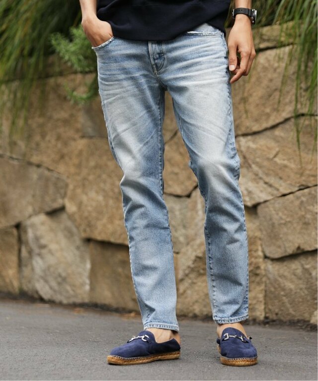 腰回りはややゆったりですが、裾に向かって軽くテーパードしているので、ダボつき感はなし。あえて少し短めに仕上げた丈感とも相まって、スッキリした印象のシルエットです。しっかり赤耳も付いているので、デニム好きでもモノ足りないなんてことはないかと。
