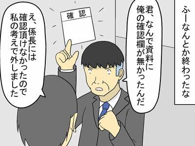 部下が仕事の確認を依頼したにも関わらず、なかなか対応をしなかった上に、終わってから「俺への確認がなかったじゃないか!」と言ってくる上司。「いや、確認しなかったのはお前だろ。」という反論をぐっと飲み込む部下…。