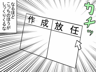 気を取り直して別の会議資料を作り始めますが、そこへ例の会議をアシストしてくれていた新人女子がやってきます。彼女は、主人公が作っている会議資料に書かれた『確認』欄を見て「欄の名前が違うんじゃないですか?」と一言。そして、次に「こうでしょ?」とにっこり笑って打ち直します。できあがった欄の名前は…なんと『放任』欄!うーん、たしかにしっくりくる…。
