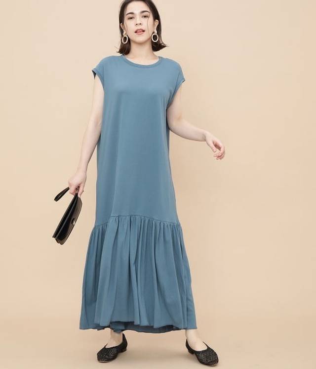 気軽なTシャツ素材を使用したワンピース。リラックス感あふれる着心地ながら、裾のティアードが存在感を放ってくれます。