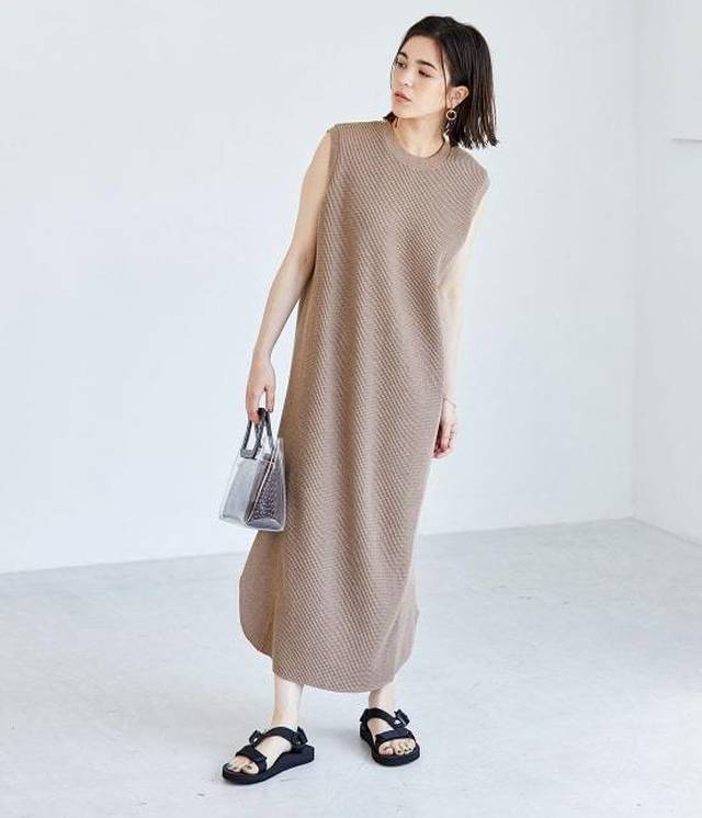 カジュアル&シンプルなサーマル素材のノースリーブワンピースは、アクセントを効かせた後ろ姿がポイント。背中のスナップボタンを少し開けて、ルーズな雰囲気をプラスしてもOKです。