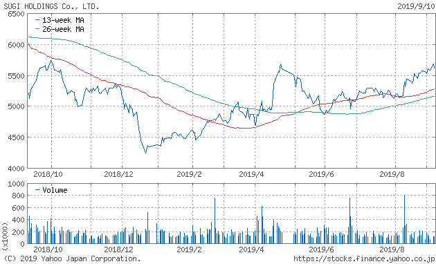 過去1年は、昨年夏には6200円を超えるなどしましたが、現在は5600円前後の株価水準となっています(2019年9月現在)。