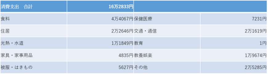 2019年に総務省統計局が公表した「家計調査報告 家計収支編2018年(平成30年)平均結果の概要(単身世帯)」によると、単身世帯(平均年齢59.3歳)の消費支出は月額約16万円程度です。