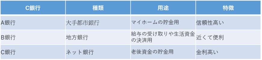 例を挙げてみましょう。(「銀行口座の使い分けの例」の表を参照)