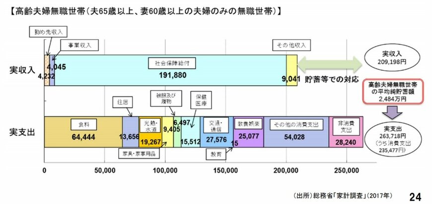この報告書では、現状の高齢者の退職後の収入、支出についても書かれています。