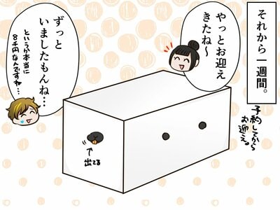 そして、さらに半年たったある日のこと。またまたまたえさをきらしてしまった祭さんは、ペットショップを訪れます。お目当ての牧草を手に入れ、「さすがにもういないかな…。」と思いつつ小動物コーナーを覗くと、そこには9割引きの8千円に値下げされた、あの黒いチンチラさんの姿が!! 安くなったからというわけではないですが、さすがにちょっと迷います。