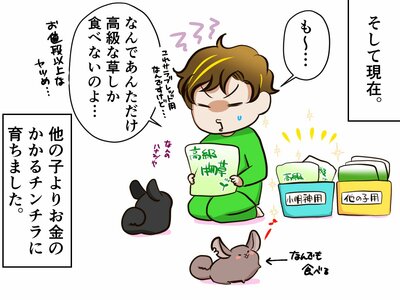 …そして現在。小明神さんはすくすくと育ちましたが、なぜか高級な牧草しか食べない贅沢なチンチラさんに!なんでも食べてくれる大明神さんやデグーたちに比べ、小明神さんの食事にはなにかとお金がかかります。