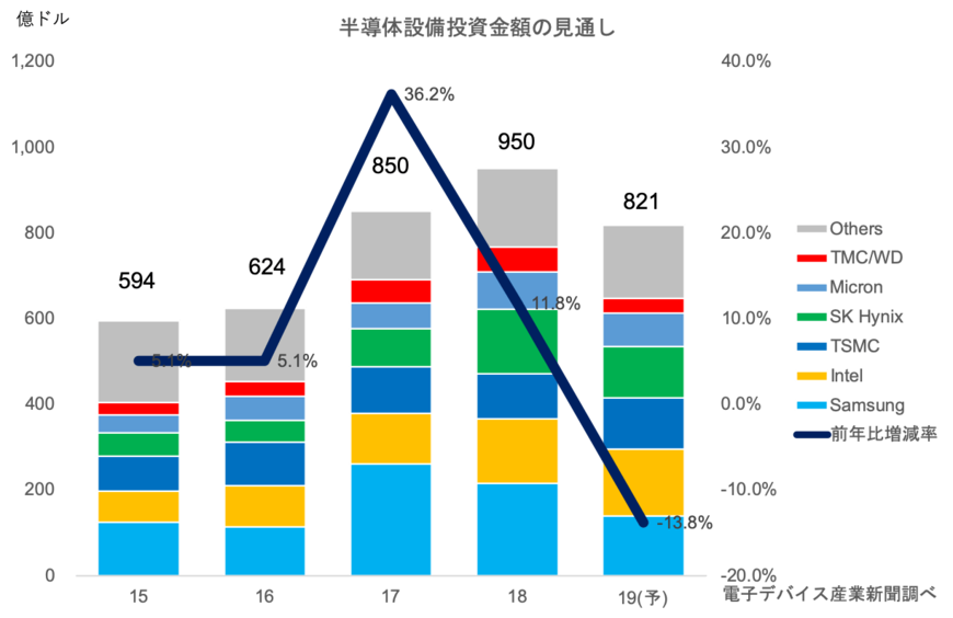 2019年の半導体設備投資は年初想定とほぼ変わらず、前年比14%減の820億ドル規模となる見通しだ(本紙調べ)。DRAM、NANDなどメモリー投資は市況回復の遅れなどにより、案件の先送りが目立っており、20年中ごろ以降の本格的な投資再開となりそうだ。一方で、ロジック/ファンドリーやCMOSイメージセンサー(CIS)などの非メモリー投資は活況を呈しており、メモリー投資の減少分を補う存在となっている。