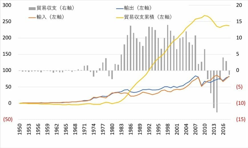 1970年代までは年によってバラつきがあり、必ずしも貿易黒字が定着していたわけではないですね。むしろ、貿易収支の累計値は1980年代まで収支トントンの状態でした。