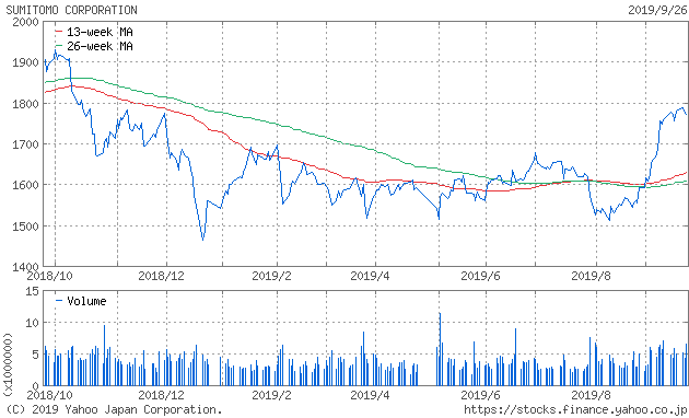 過去1年は、昨年秋には1900円を超えるなどしましたが、現在は1700円台の株価水準となっています(2019年9月現在)。