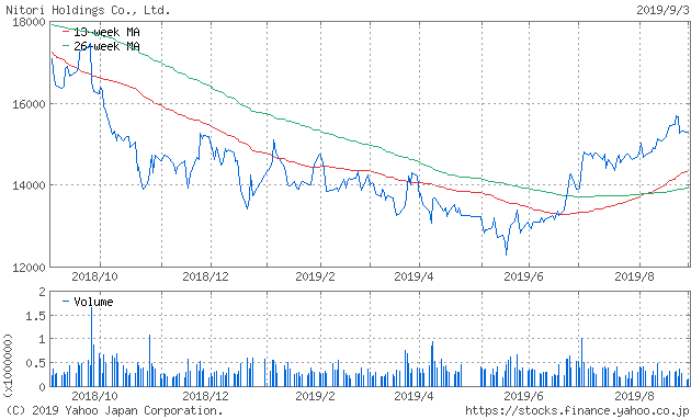 過去1年は、昨年夏には1万7000円を超えるなどしましたが、現在は1万5000円前後の株価水準となっています(2019年9月現在)。