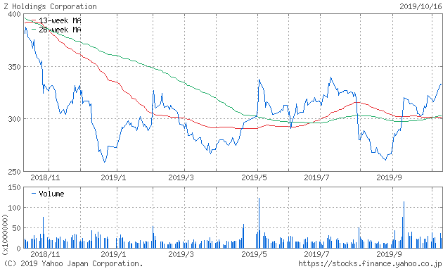 過去1年は、昨年秋には400円を超えるなどしましたが、現在は300円台前半の株価水準となっています(2019年10月現在)。
