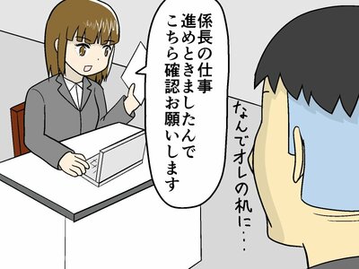 そうこうしているうちに、ようやくタバコ休憩を終えて、自席に戻ってきた係長。すると、新人女子が、係長のデスクに座ってパソコンのなにやら操作をしています。そして戻ってきた係長を見ると、にっこり笑って「係長の仕事を進めておきましたので、こちらの確認をお願いできますか?」と一言。