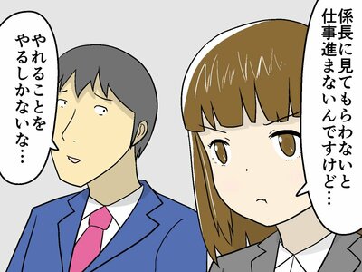 しかし、さすがにそんなことは不可能。主人公は「はい、先に戻ります。」と、オフィスに向かって歩きだすと、新人女子が「係長に見てもらわないと、仕事が進まないんですけど…」と不満をボソリ。「やれることをするしかないな…。」と、あきらめ顔で答える主人公。