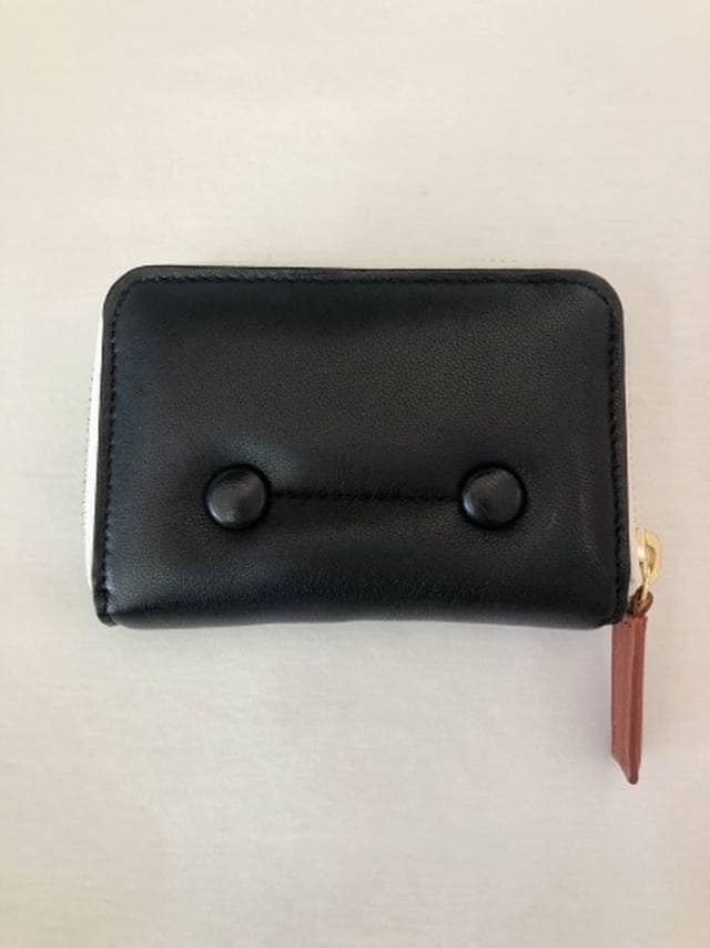 フロントのボタンデザインが印象的なミニウォレット。ファスナーのブラウンや、中のベージュなどシンプルながらも工夫されたカラーリングがおしゃれ。可愛らしい丸みのあるシルエットも特徴です。