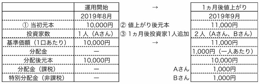 この投資信託は基準価額が10,000円で設定(運用開始)されたとします。当初、投資家は1人(Aさん)だけだったとします(①)。この投資信託が1ヵ月後に11,000円に値上がりしたとします(②)。ちょうど決算と重なりましたが、この時点で新たな投資家Bさんが11,000円でこの投資信託を買ったとします(③)。