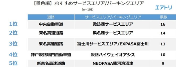 景色編ランキングの2位以降は、SAを発着場として湖上遊覧が楽しめる「浜名湖SA」、富士山の大パノラマを一望できる「富士川SA/EXPASA富士川」がランクイン。4位の「淡路ハイウェイオアシス」、5位の「NEOPASA駿河湾沼津」を含め、大きな得票差はありませんでした。どのPA・SAにおいても、息を呑むほど美しい景色が楽しめるでしょう。