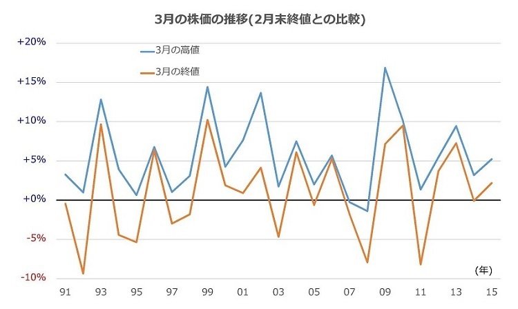 “お化粧買い”の出る3月の株式相場は強いというイメージがあります。実際、過去25年を振り返ると、いったんは2月末より高くなりますが、3月末には腰折れとなるパターンも散見されます。
