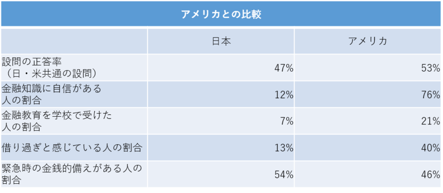 前回調査よりも上昇傾向にある金融リテラシーですが、他国と比較するとどうなのでしょうか。(表「日本と海外の金融リテラシー比較」を参照)