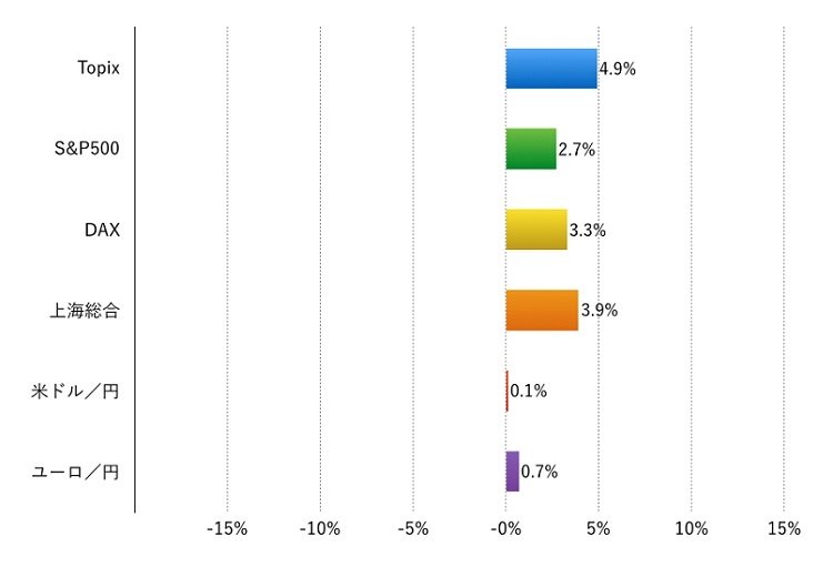G20声明の流れを受け、中国が全国人民代表大会(全人代)において景気対策を強化する期待が高まりました。さらに、需給改善の思惑から原油価格が上昇したことで世界的にリスクオンの相場となり、中国株関連を始めとして新興国の株式市場の上昇が目立ちました。一方、主要国の長期金利は上昇しています。