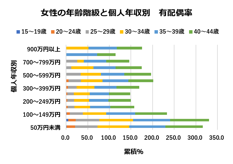 一方、女性の有配偶率と個人年収の関係は複雑です。(表「女性の年齢階級と個人年収別 有配偶率」を参照)