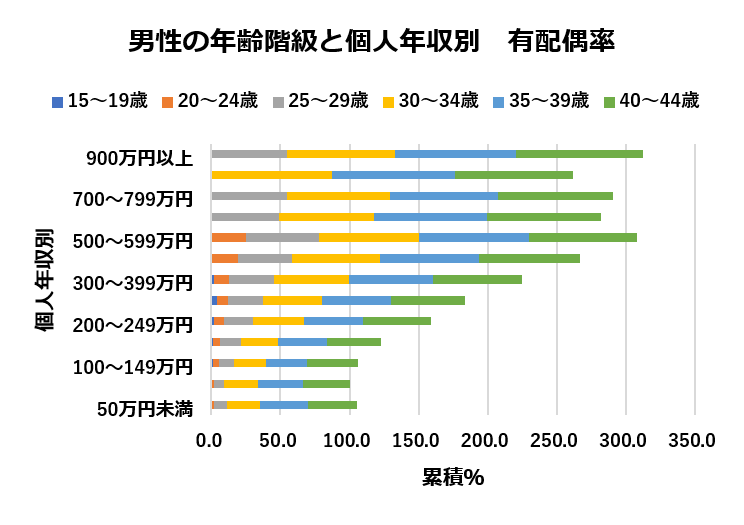 男性の有配偶率は、おおむね個人年収が上がるにつれてアップしていく傾向にあります。個人年収が600万円以上になると有配偶率は減少傾向に転じますが、個人年収900万円以上の階級では有配偶率が最も高くなります。