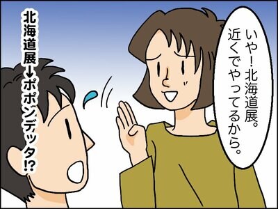 先日のことです。まっきーとプラレール展に遊びに行く約束をしたなおにゃむさん。せっかくなので、ついでに近くのデパートでやっている北海道展にも行ってみよう、と思い立ちます。早速、まっきーに「プラレール展のあと、北海道展に行こう!」と提案してみました。すると「え?ポポンテッタ?」と目を輝かせるまっきー。
