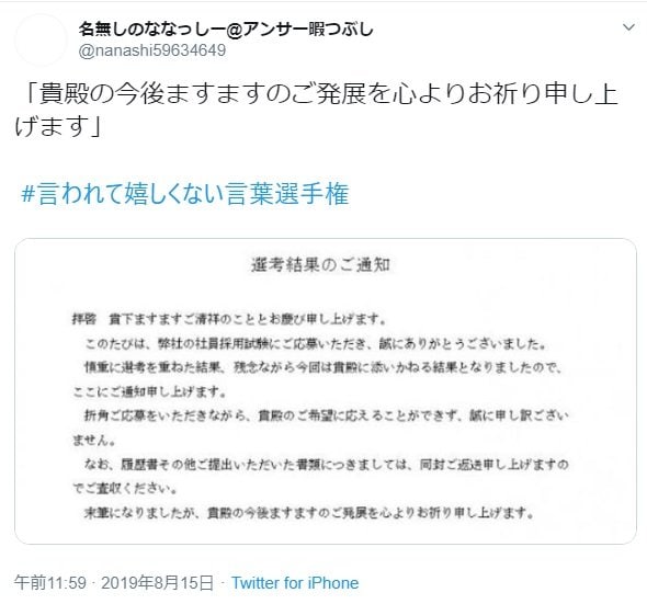 就職活動中によく受け取る言葉。いくつも受け取ると「また祈られた」なんて言うことも。「祈る」と「折る」はとても似ていますね……。