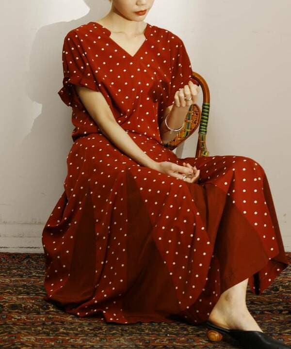 パターンの違うドット柄を組み合わせた、他では見られないデザインのロングスカート。フレア部分に三角形の生地をはめ込んだことで、グラマラスなシルエットを実現しました。