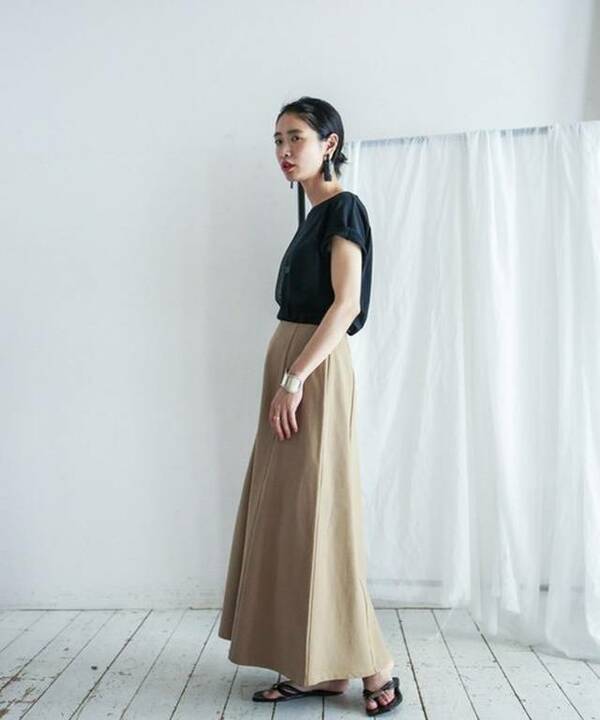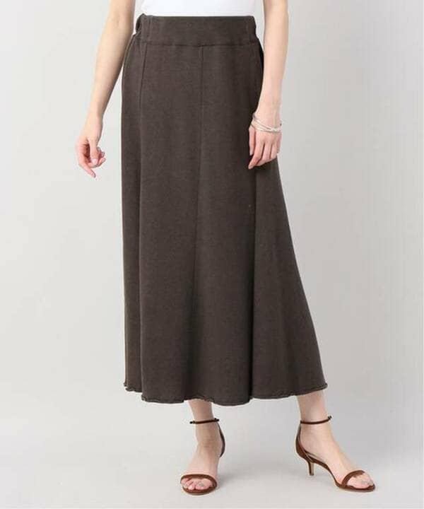 カジュアルな裏毛素材と、女性らしい「マーメイドシルエット」の調和が見事なマキシスカート。リネンを加えて"シャリ感"を出した、大人っぽい生地感も印象的です。