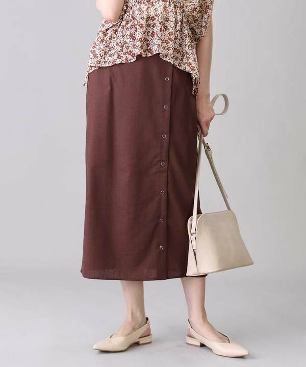 裾にかけてほのかに広がる、控えめなシルエットが今年っぽいロングスカート。サイドにはスナップボタンをあしらい、スポーティな雰囲気もプラスしました。