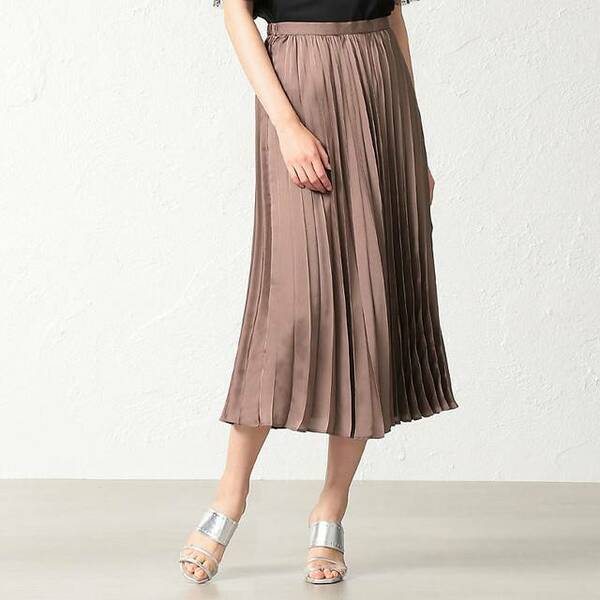 艶やかなブラウンのサテン地が、ドレッシーな印象をもたらすプリーツスカート。女性らしさを高めてくれる素材感は、辛口アイテムとも好相性。