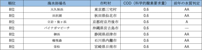 まずは同ランキングの上位10項目を抜粋。沖縄県の離島3地点、そして静岡県内の海水浴場2地点が1位タイに入りました。どれもCODが0.5mg未満かつ水質判定はAA。国内最高レベルの水質を誇る海水浴場です。また1位タイの内、静岡県沼津市にある「井田海水浴場」および「平沢(らららサンビーチ)」がランクインしたのは、意外だったかもしれません。