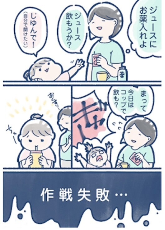 娘さんに薬を飲んでもらおうと奮闘しますが、娘さんはすべての手段をくつがえすパワーを発揮。体調がよくないはずの2歳児、どうしてこんなにパワフル……?