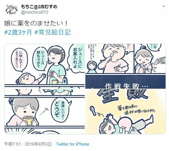 小さな子供のお世話をする人共通の悩みをTwitterに投稿したのはもちこ(@mochico913)さん。2歳の娘さんがいます。何とか娘さんに薬を飲んでほしいけれど、なかなか飲んでもらえません。