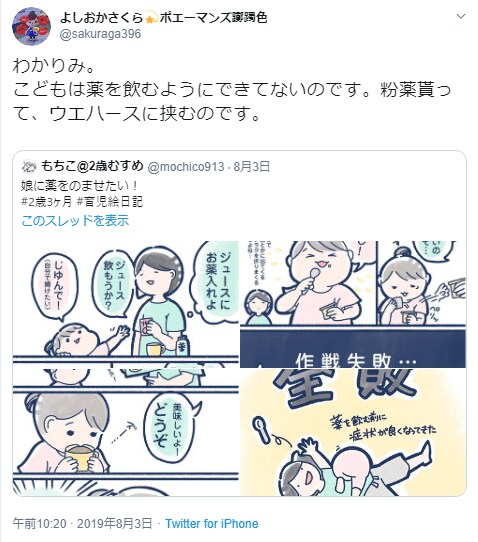 もちこさんの娘さんのように自分でジュースやヨーグルトのパッケージを開けたい子供には「自分で薬を混ぜてもらうのがいいかも」という意見もありました。少量の水を混ぜて練ったり型に入れたりして食べる「知育菓子」のような感覚で楽しみながら飲めるようになるかも、ということでしょう。