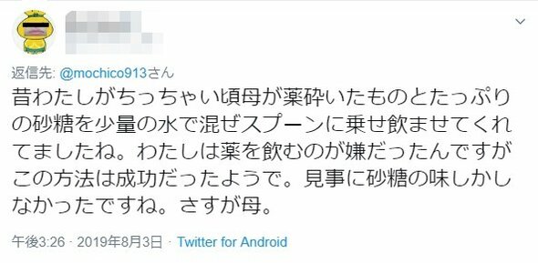 「昔わたしがちっちゃい頃母が薬砕いたものとたっぷりの砂糖を少量の水で混ぜスプーンに乗せ飲ませてくれてましたね。わたしは薬を飲むのが嫌だったんですがこの方法は成功だったようで。見事に砂糖の味しかしなかったですね。さすが母。」