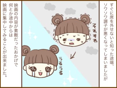 一時期は娘さんの幼稚園への送迎も危うい状態でしたが、ライブ観賞やテーマパークへのチャレンジなど、少しずつ1つずつ乗り越えて、今回は映画館と、また一歩前進。「よし!次来るときは、入口側の端の席を確保するぞ!」と、再び映画館に来ることを決意する、しらたまママさんなのでした。